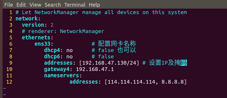 addresses: [192.168.47.130/24] # 设置本机IP地址及掩码