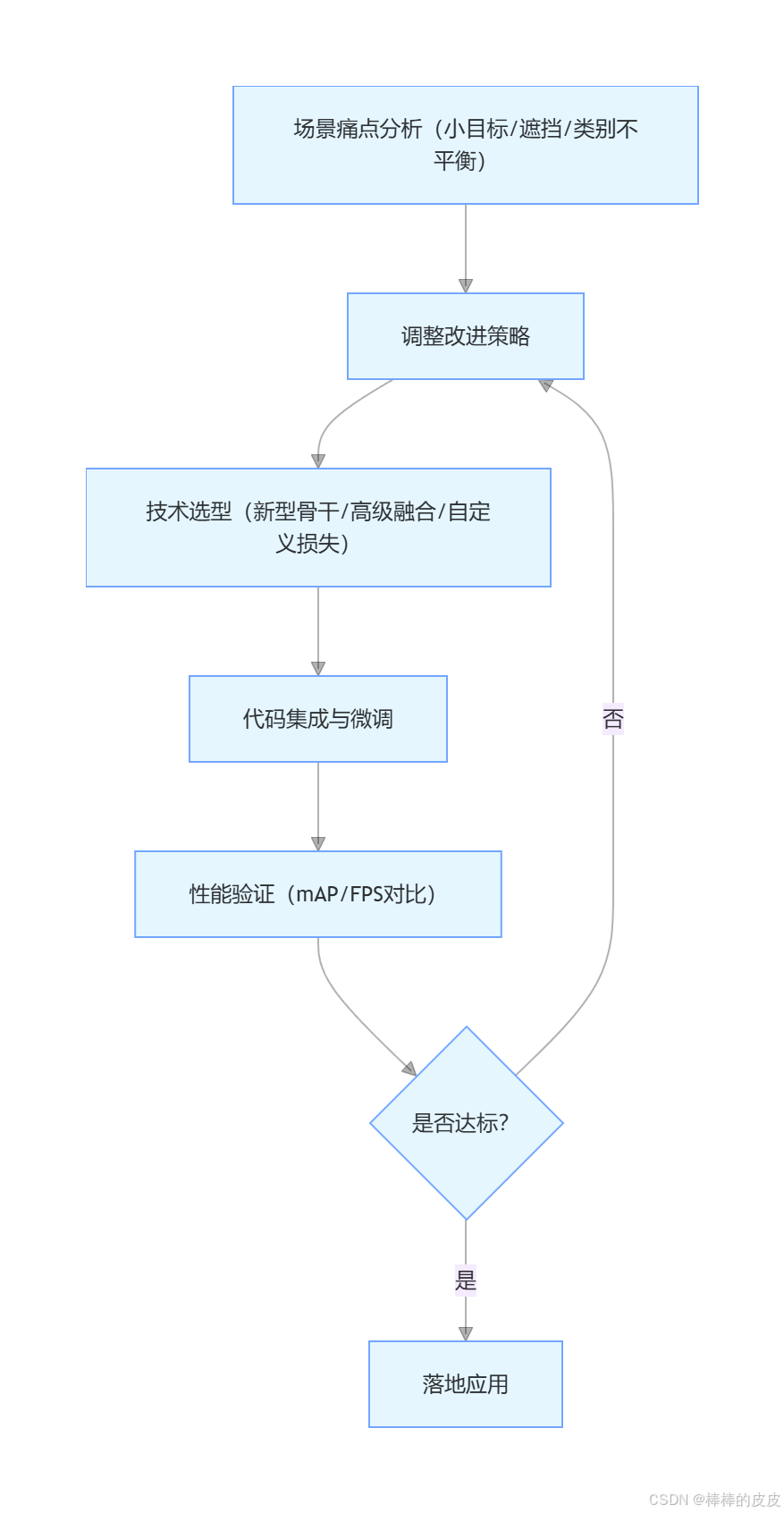 YOLO 算法的三段式架构(骨干→颈部→检测头)中,骨干网络决定特征提取上限,特征融合决定多尺度特征利用效率,损失函数决定模型优化方向 。三者的改进需遵循「算力匹配、场景适配、精度 - 速度平衡 」原则,改进流程如下: