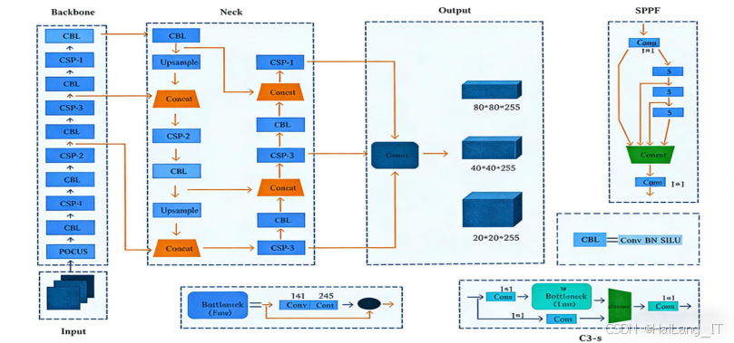 YOLOv5s是YOLO系列目标检测算法中的轻量级模型,具有检测速度快、精度较高的特点。其网络结构主要包括Input、Backbone、Neck和Output四个部分: