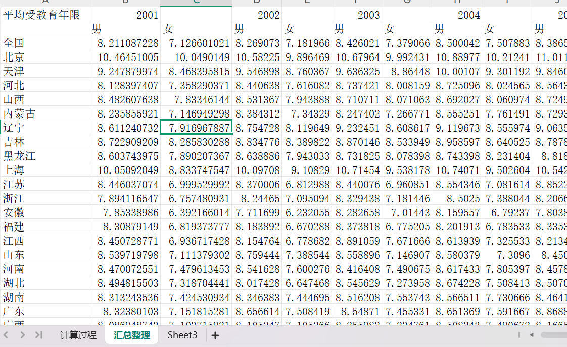 2001-2024年各省分性别平均受教育年限数据(含原始数据+计算过程+结果)