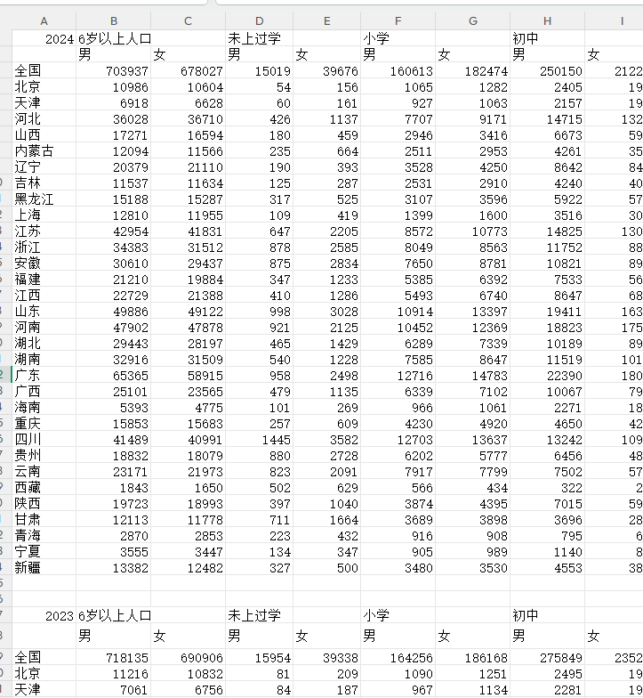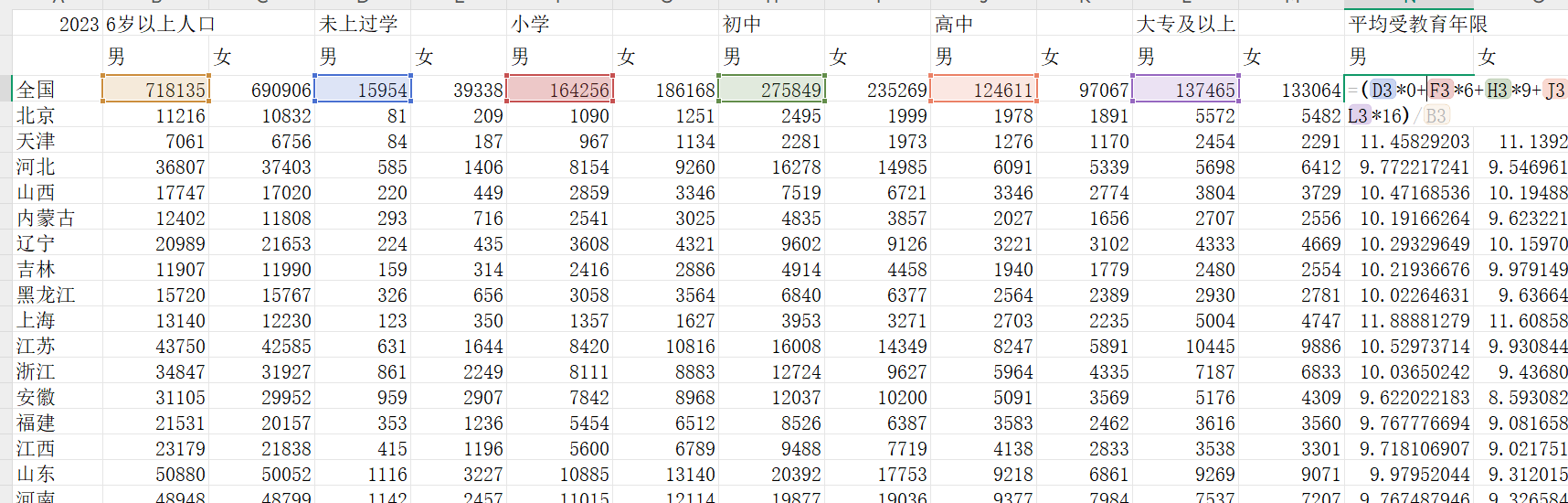 3、指标:6岁以上人口数、未上过学人口数、小学人数、初中人数、高中人数、大专及以上人数、男性平均受教育年限、女性平均受教育年限