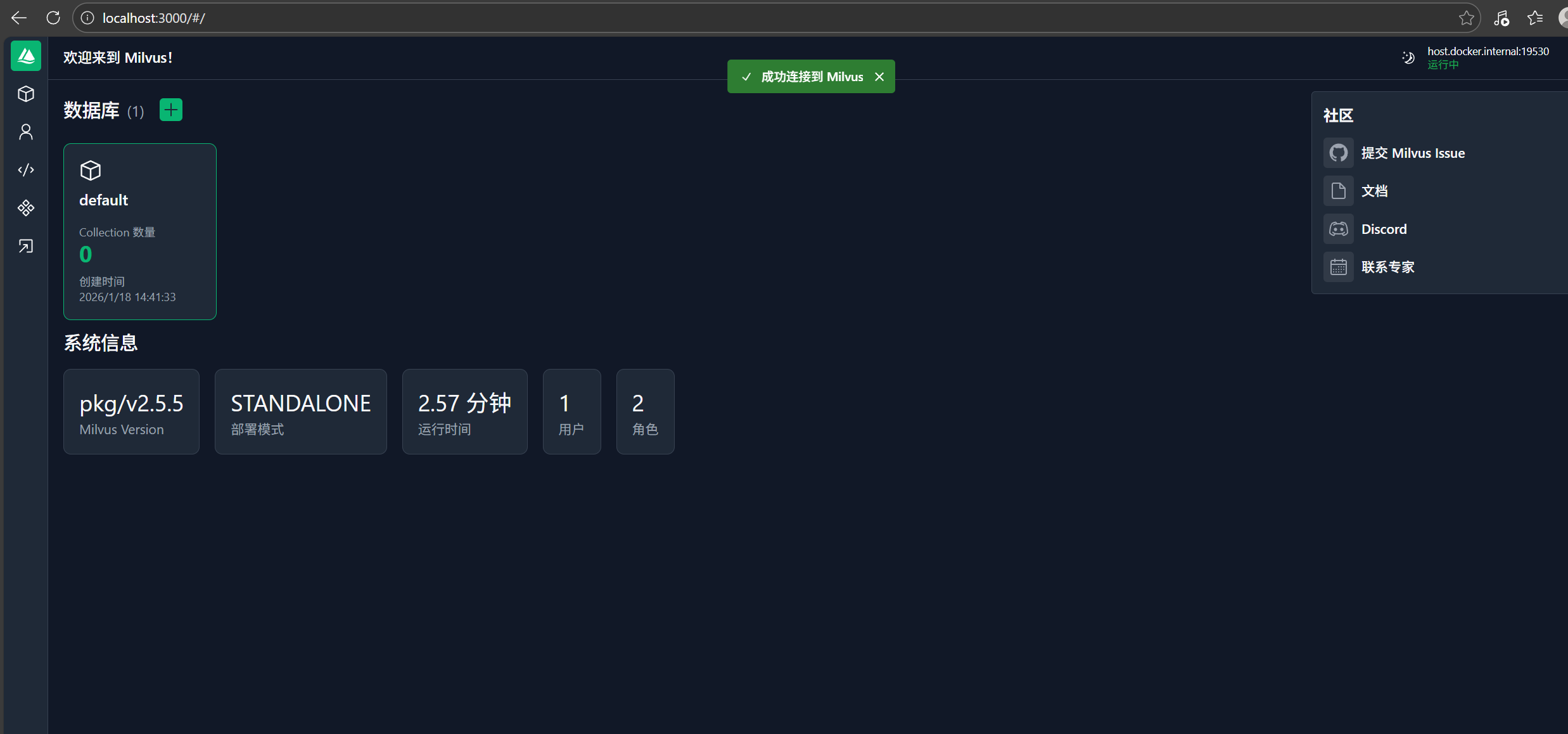5.访问链接 http://localhost:3000,启动Milvus(这里不做认证,直接链接)。如无法链接成功,重新进行上述步骤