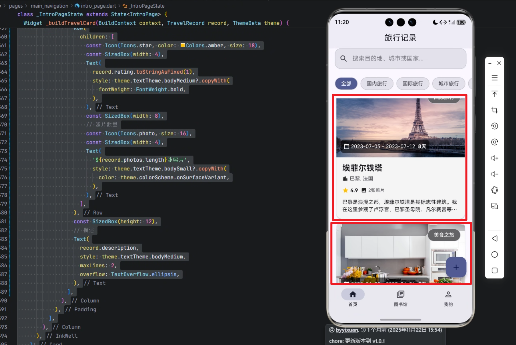 单个旅行记录卡片,看似只是列表中的一个普通组件,实则承载着应用最核心的业务信息与用户情感入口。在 Flutter × OpenHarmony 的跨端开发体系下,通过组件化思维对卡片进行设计,不仅可以大幅提升代码复用率,还能让 UI 结构更加清晰、可维护性更强。