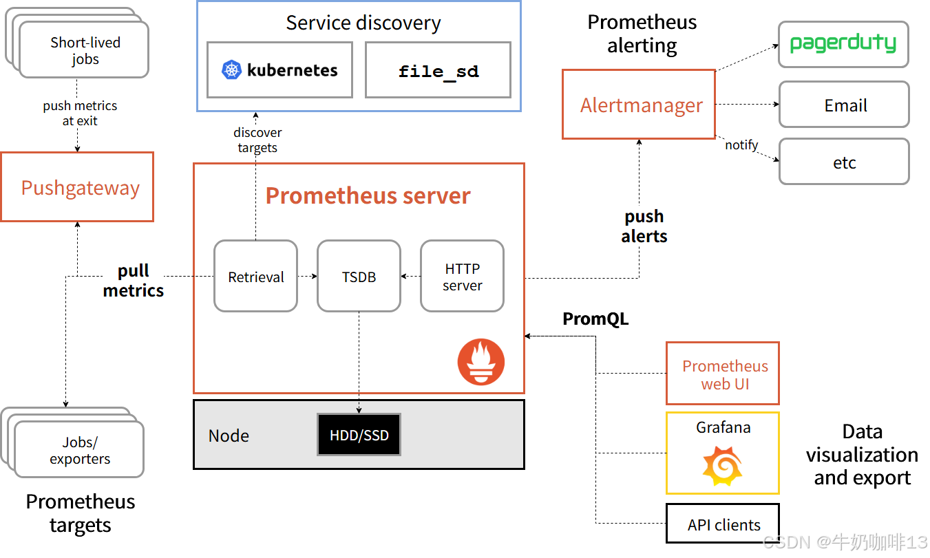| 4 | Prometheus Server 通过HTTP Server 对外开放接口,通过可视化工具(如:prometheus web UI、Grafana或自己开发的工具)以PromQL查询、导出数据。 |