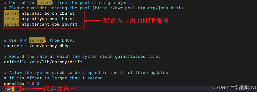 #【/etc/chrony.conf】文件中第一行中的NTP服务器修改为国内的