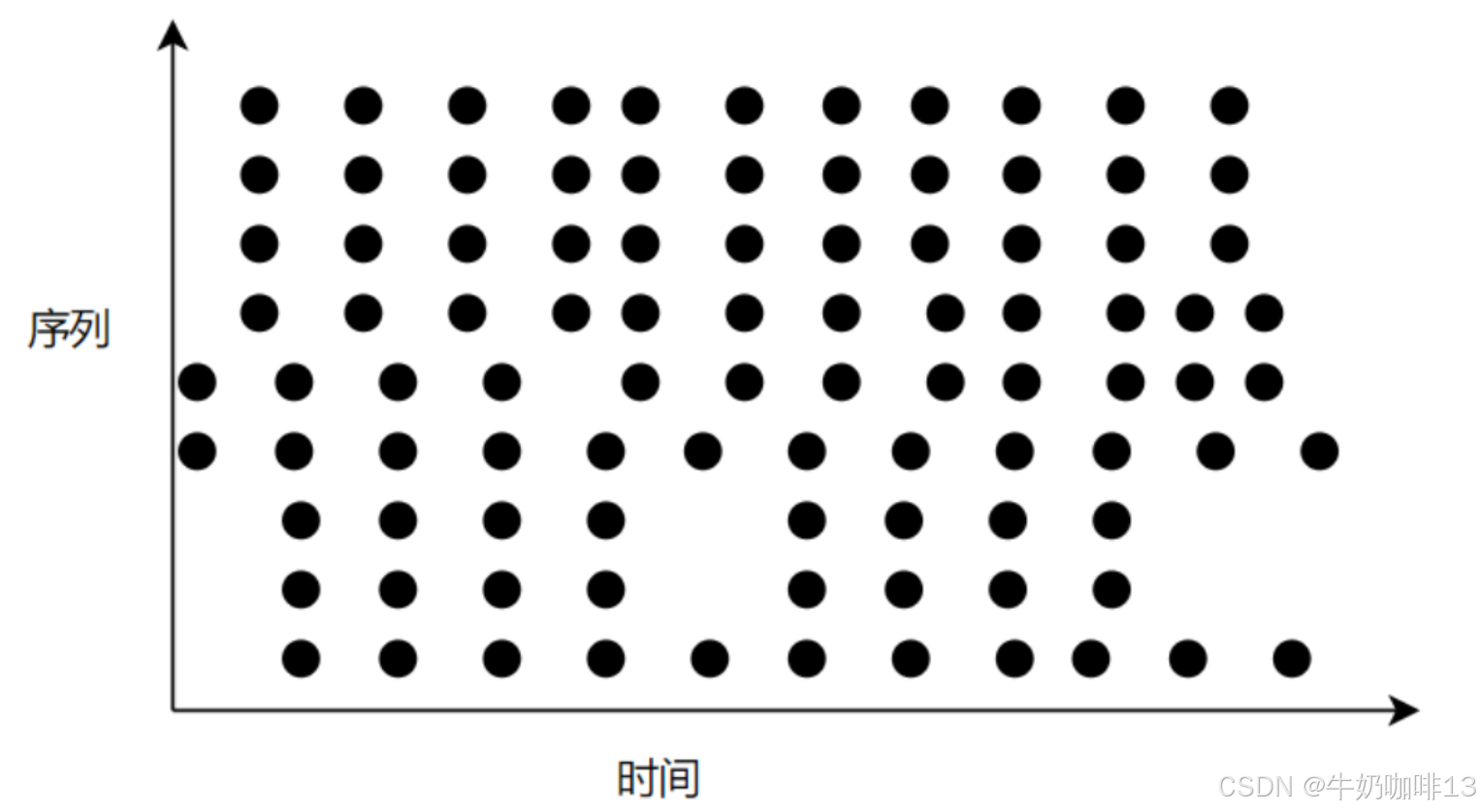 时间序列数据库主要按照一定的时间间隔产生一个个数据点,以时间轴为横坐标,序列为纵坐标。如下图所示: