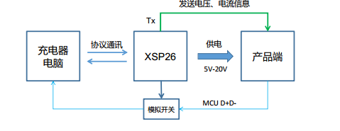 XSP26支持快充取电和支持与主板MCU共用Type-C接口的D+D-通道,在连接充电器时正常取电,连接电脑时自动切换通道以实现固件升级或数据传输,适用于需要程序下载的设备。