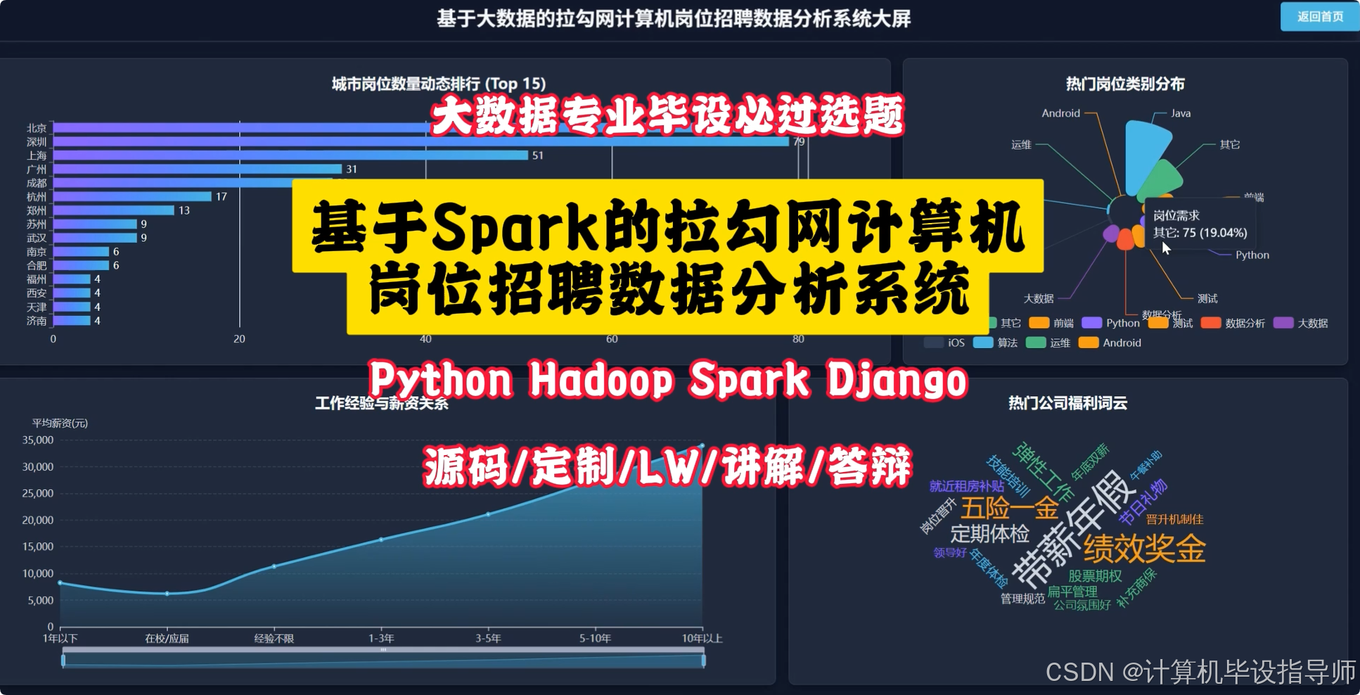 本系统是基于Spark的拉勾网计算机岗位招聘数据分析系统,旨在通过大数据技术为计算机专业的学生提供一个直观、全面的行业招聘市场洞察。系统整体架构采用Hadoop生态进行分布式存储,利用Spark核心及Spark SQL进行高效的大规模数据清洗、转换与计算分析。后端服务采用Python语言及Django框架进行业务逻辑处理与API接口开发,前端则通过Vue结合Echarts、ElementUI等组件库,实现动态交互的数据可视化效果。系统的核心功能紧密围绕招聘市场的多维度分析需求展开,涵盖了从宏观到微观的多个层面,包括不同城市的岗位数量与薪资分布、主流技术方向的需求热度与薪酬水平、工作经验与学历对薪资的影响、热门招聘公司及福利分析等15个具体分析点。系统将复杂的原始招聘数据,经过Spark分布式计算处理后,转化为清晰易懂的图表和排名信息,最终以Web界面的形式直观呈现,帮助用户快速把握就业市场动态,为职业规划和技术学习方向提供有力的数据支持。