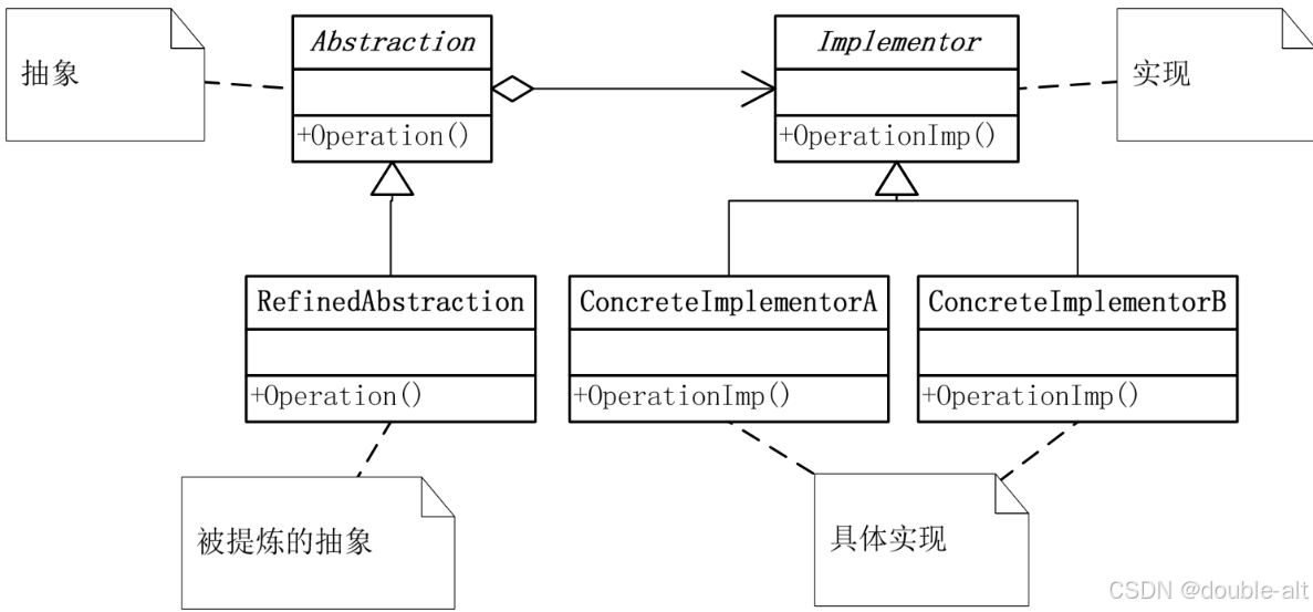 由于实现的方式有多种,桥接模式的核心意图就是把这些实现独立出来,让它们各自地变化。这就使得每种实现的变化不会影响其他实现,从而达到应对变化的目的。