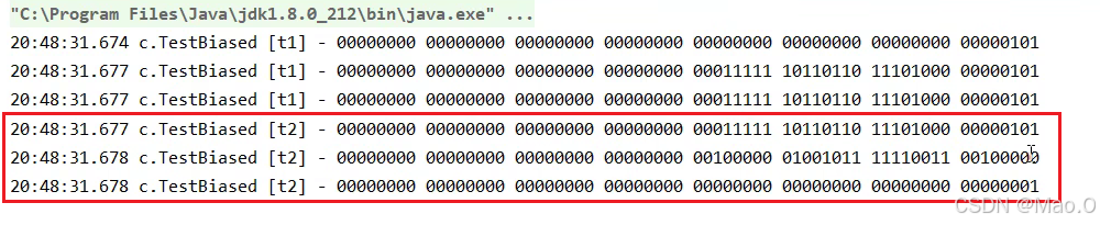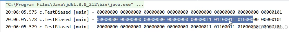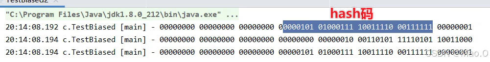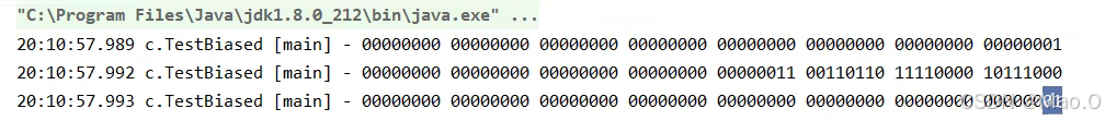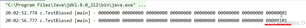 可以看到,第二个打印时使用了sychronized关键字给对象加了偏向锁,因此后10位显示其他数值,剩下的为线程ID,就算第三次打印再解锁之后,依然会显示线程ID,因为这就是偏向锁对于轻量级锁的优化。