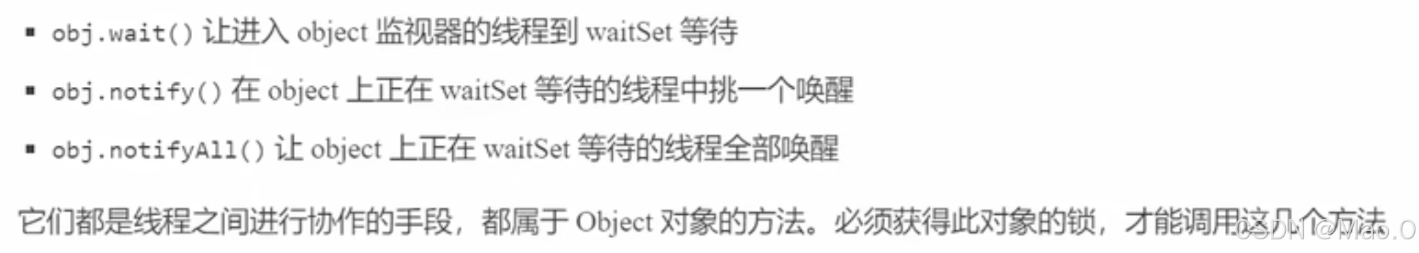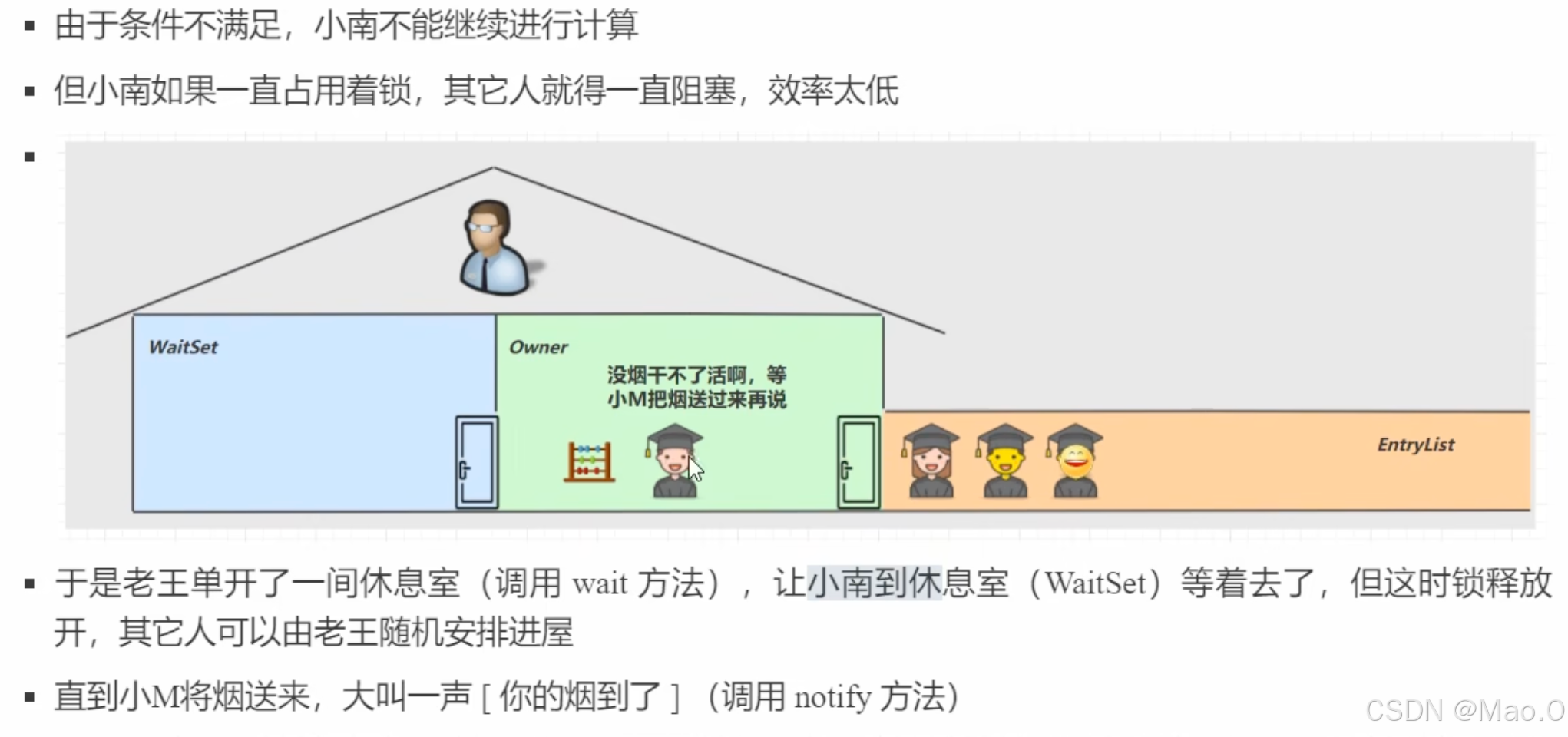 值得注意的是:notify() 方法是从waitSet中随机挑一个唤醒。
