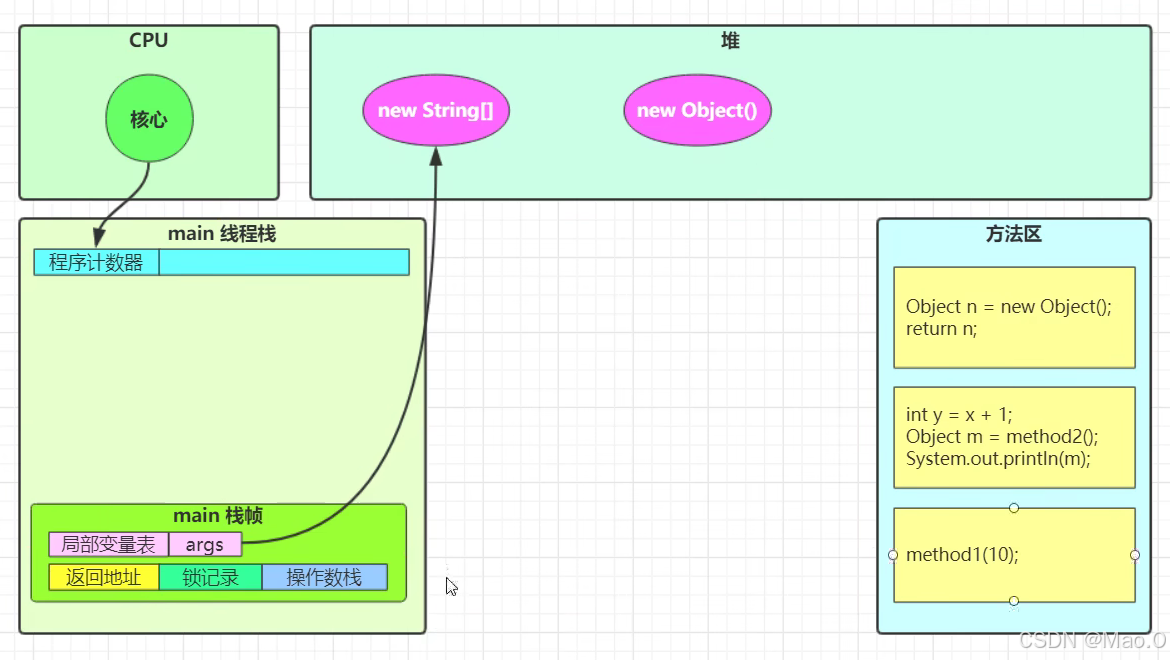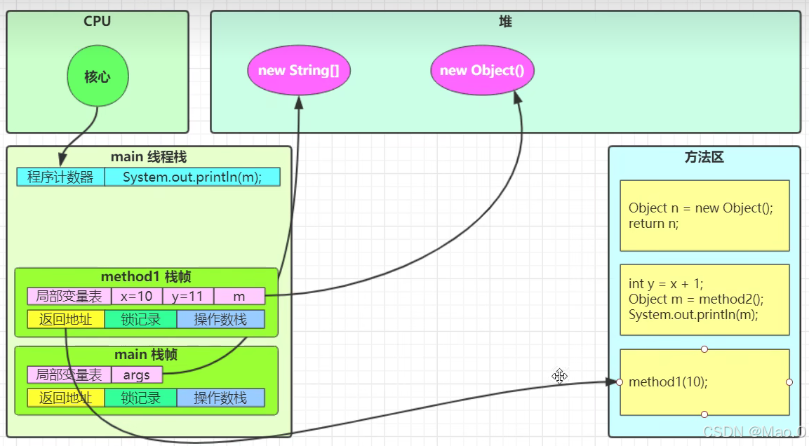 然后将第一行代码赋予给"程序计数器"开始执行代码,首先会执行main方法,给main方法创建一个栈帧内存,发现main方法中调用了method1()方法,然后会创建method1方法的栈帧内存。