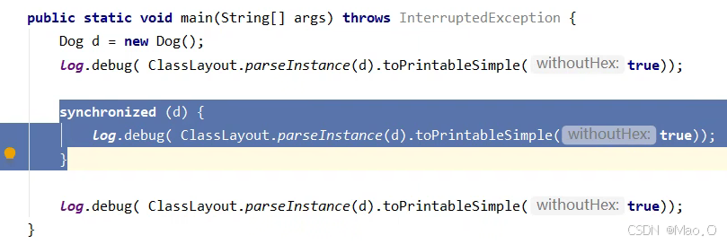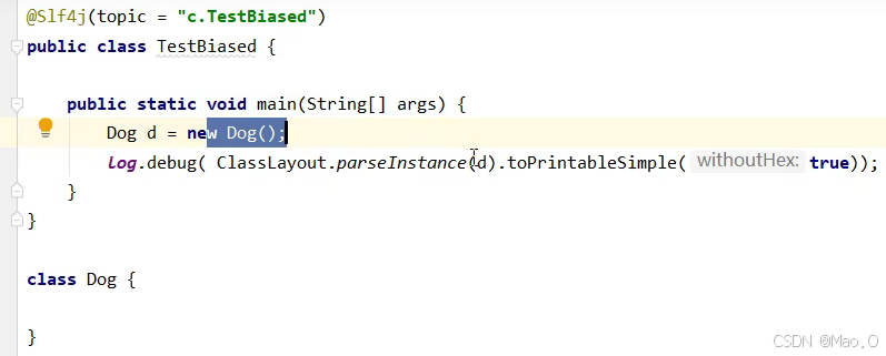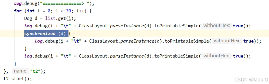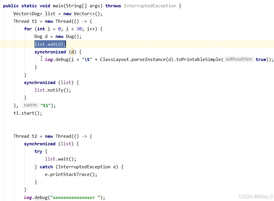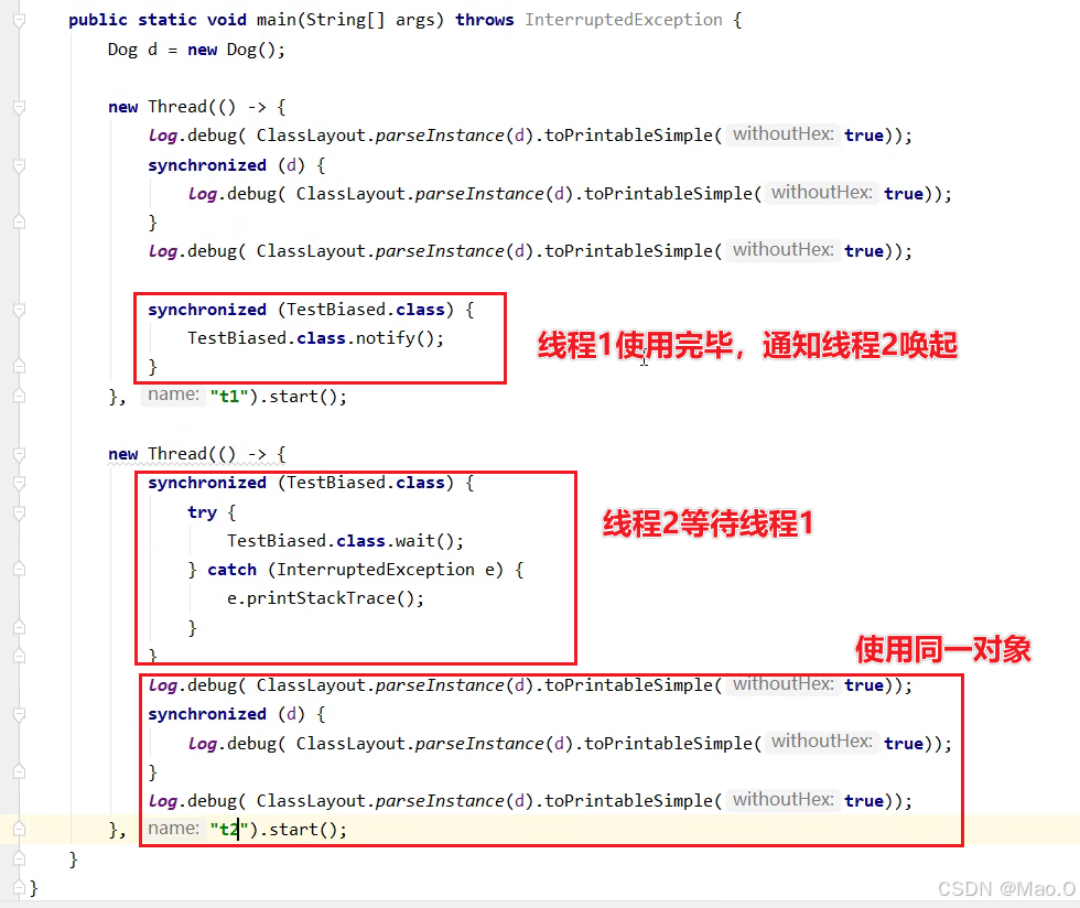 代码解读,线程1循环给30个对象加偏向锁,执行完毕后通知线程2,线程2再循环给30个线程加锁观察状态。