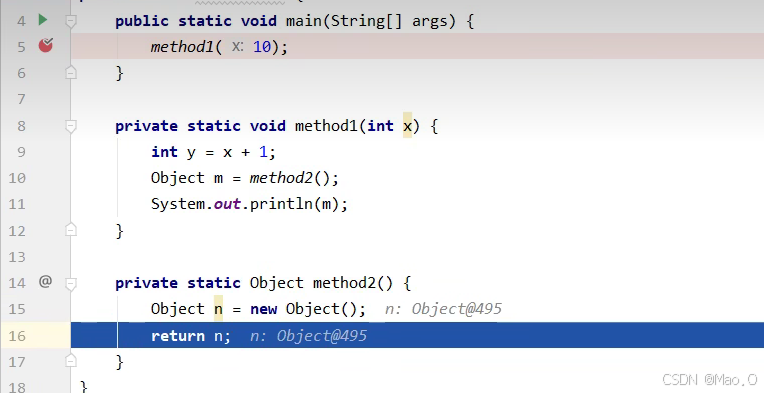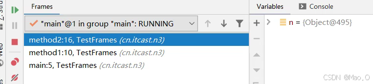 当执行上述代码,总共会执行三个方法:mian, method1, method2 ,从debug的视图看,会看到三个栈帧,执行完后方法后会自动释放掉对应的栈帧。