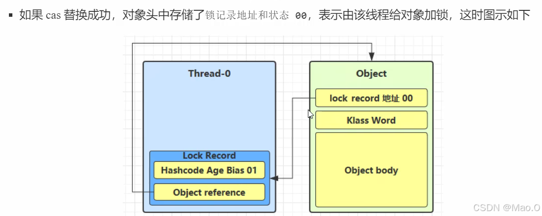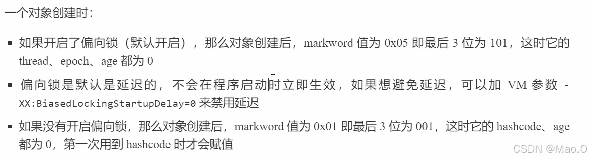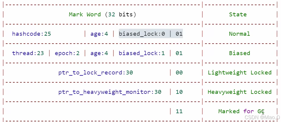 当是无锁状态 时,mark word中正常存储对象相关数据,如hashcode,状态为01,和偏向锁区分的一点为biased_lock为0。