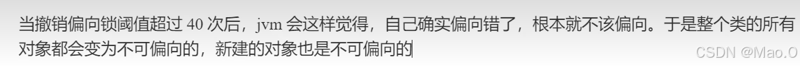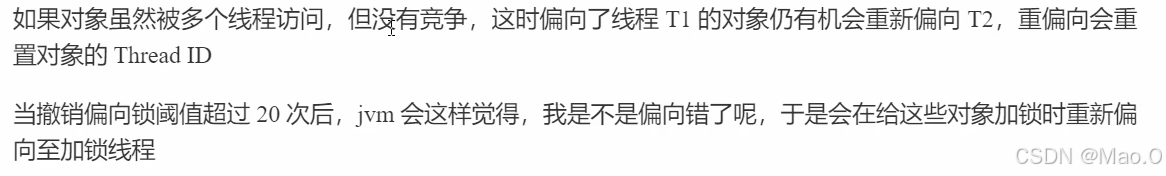 结果:线程1给30个对象加的全部是偏向锁,而线程2的前20个全部加的是轻量级锁,也就是前20个全部出现了锁撤销的情况,当到达阈值20之后,而就是线程2执行到第20个线程加锁的时候,jvm会认为"是不是偏向错了",因此再剩下的10个线程加锁时,会加上偏向锁,批量偏向线程2。
