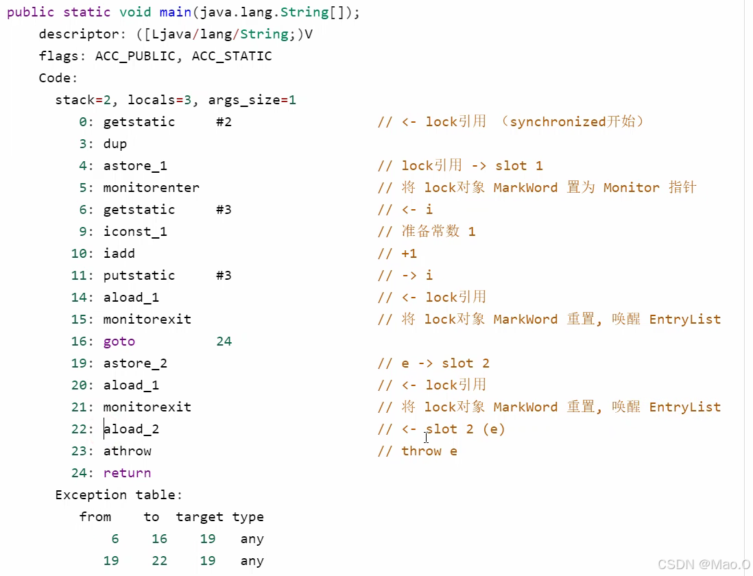 看到16有指令 goto 24 ,这是代码正常运行的时候走的路径,如果逻辑代码出现异常,则执行19-23行指令去解锁,所以使用sychronized不必担心死锁问题。