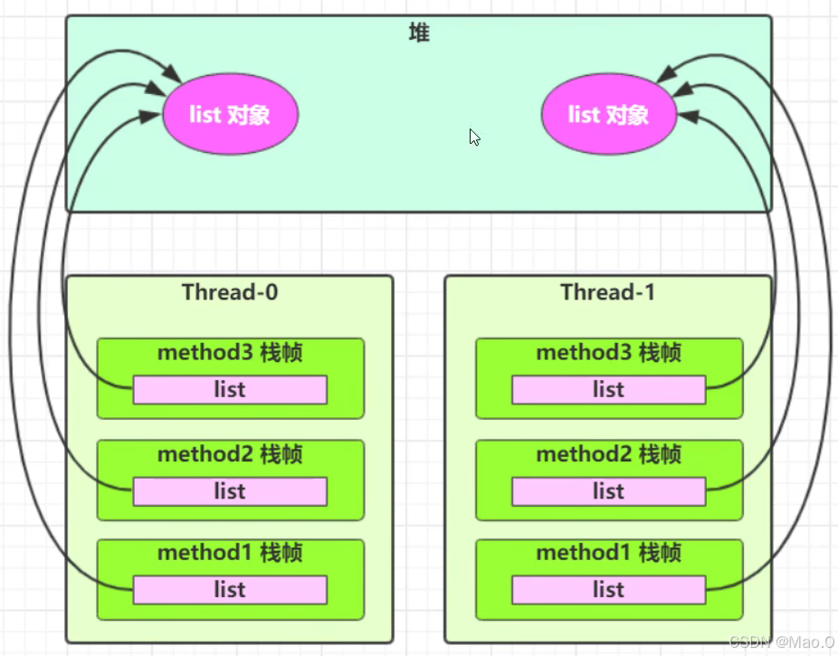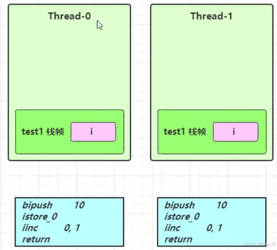 test1方法中的 i 局部变量会在每个执行线程的栈帧内存中创建,因此每个线程都会拥有一份 i 变量,在不同线程中操作的 i 对象不是同一个,不存在共享不存在线程安全问题。