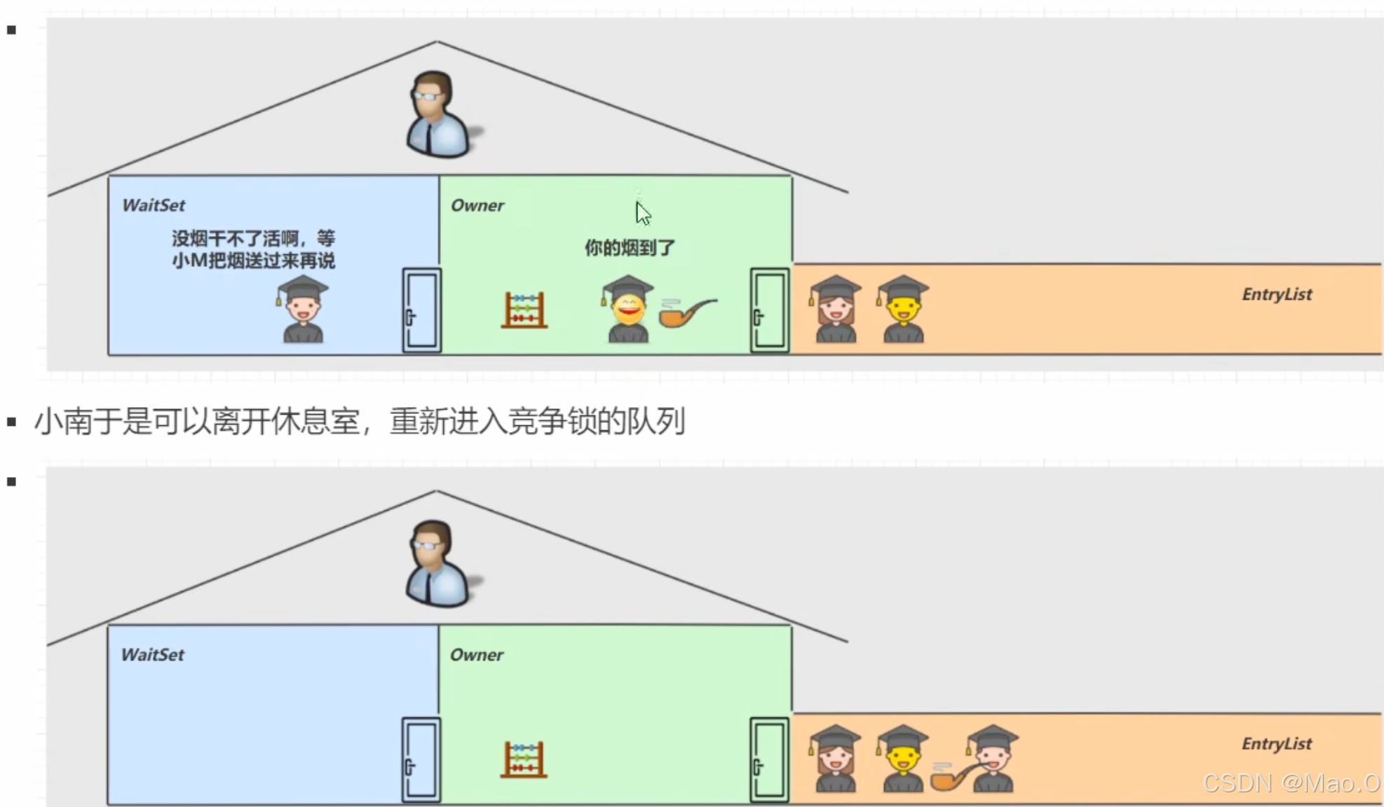 当被notifyAll()唤醒时,使用标识变量和while()去判断是否为"虚假唤醒",是的话重新进行waitSet等待正确的唤醒。