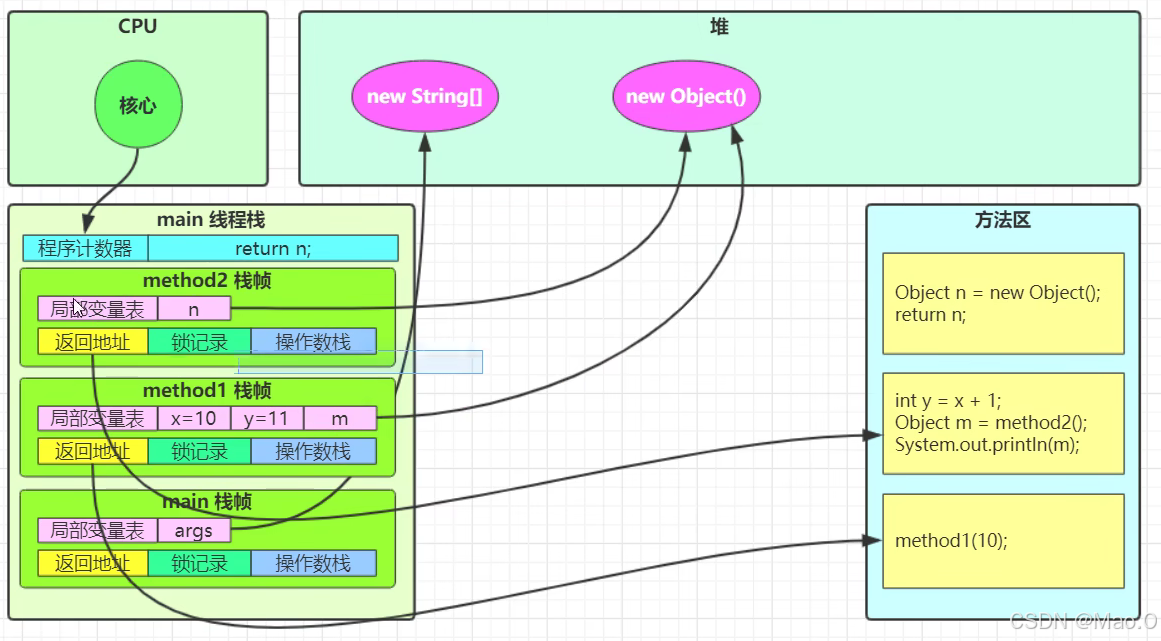 创建栈帧内存的时候也会把方法内用到的变量内存预先创建好,然后随着代码逐步执行(程序计数器往下)到末尾就通过"返回地址"返回上一步代码调用处,释放掉已经执行完毕的方法栈帧。