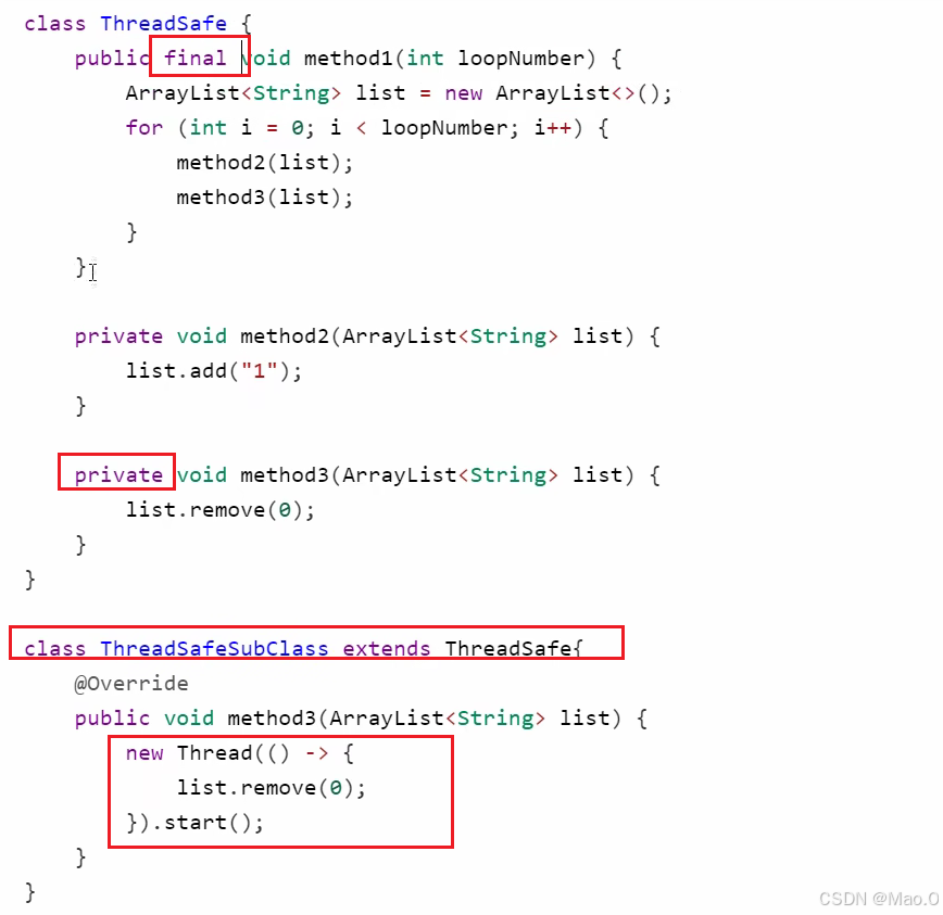 如上定义了一个子类去继承线程安全的父类,如果子类中如上声明了一个新线程去操作父类中的局部变量(前提是子类可以重写父类的public方法),也会造成线程安全问题。所以如果不希望子类影响到父类的方法,可以将方法声明为Privte或加上final关键字以保护安全。