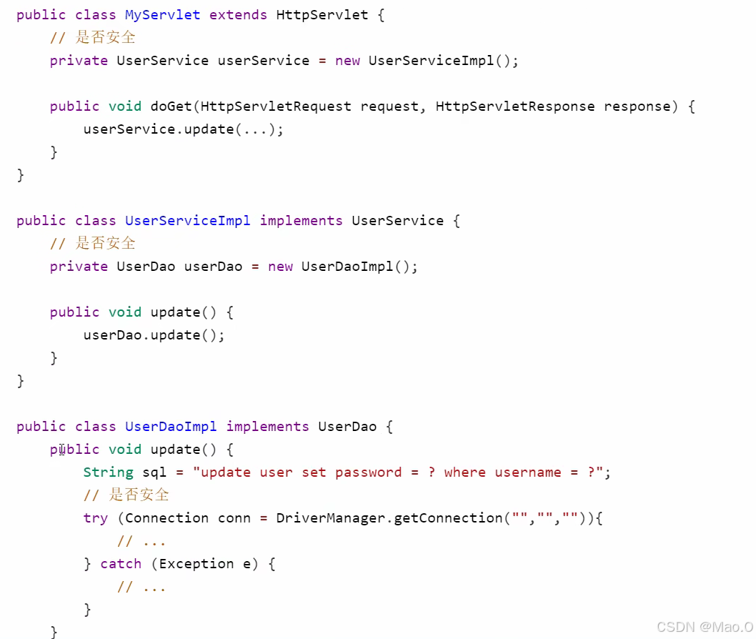 如上的写法是线程安全的,因为DAO中没有成员变量很好判断,没有共享的资源,不会产生线程安全的问题。