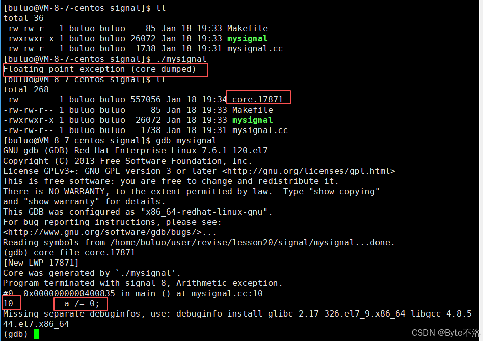 可以看到当我使用简单的整除除零的错误程序时,通过核心转储和gdp调试程序就可以快速找到我们出错的行数以及内容,这样可以帮助我们快速找到使我们程序异常的代码,这就是核心转储(core dump)的功能。