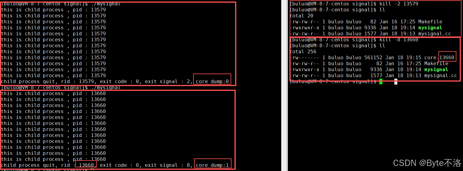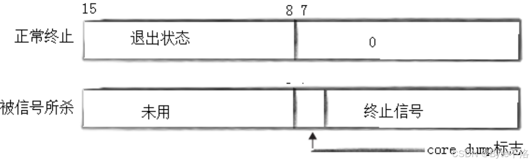 这个就是进程等待那里我们了解的内容,其中当进程正常终止的时候,我们用系统调用waitpid中的输出性参数status中低16位中的次低8位(8-15)表示进程退出时的退出码,还有一个就是低7位(0-6)表示终止信号,而其中的第7位就是core dump标志位,他就是表示我们是term终止的方式还是core终止的这种方式,接下来我们现在来测试一下。