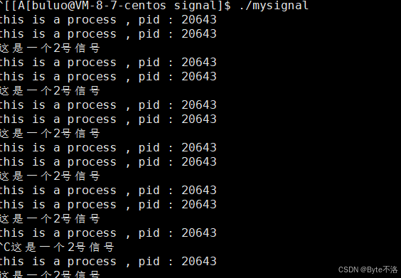 可以看到我们的进程在收到2号信号之后,不是默认的终止行为,而是我们自定义的打印一条语句的行为。