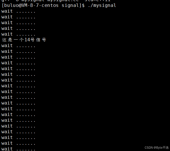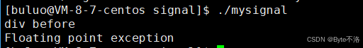 可以看到我们的结论是正确的,确实整数除0之后,进程会收到一个8号信号,但是现在就有一个问题就是,我们明明只是除了一次0,按照正常的逻辑,即使我们自定义行为了,它也因该只打印一条语句就好了呀,但是从结果来看,这个程序反而一直在打印,这是什么原因呢?难道是进程一直收到8号信号吗?但是我明明只是除了一次0,而且自定义的行为也已经执行了,为什么还会一直打印呢?