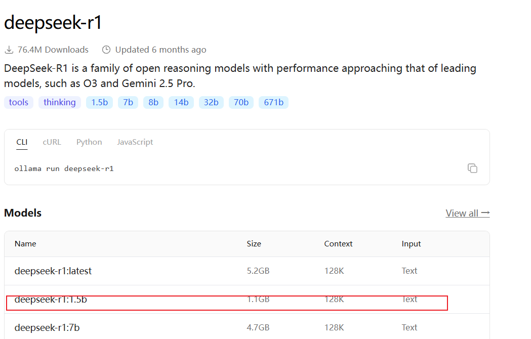 第三步,在ollama官网下载deepseek r1 (https://ollama.com/library/deepseek-r1)