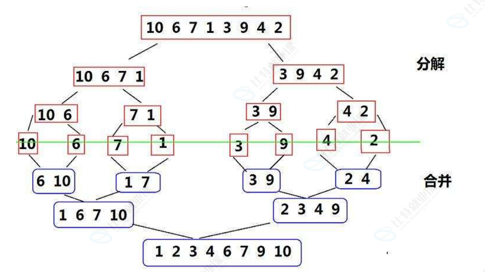 归并排序(MERGE-SORT)是建立在归并操作上的一种有效的排序算法,该算法是采用分治法(Divide and Conquer)的一个非常典型的应用。将已有序的子序列合并,得到完全有序的序列;即先使每个子序列有序,再使子序列段间有序。若将两个有序表合并成一个有序表,称为二路归并。