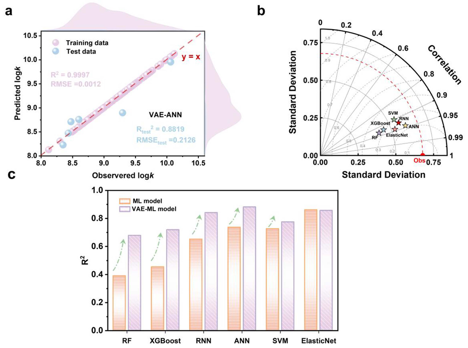 高级氧化 / 还原技术(AOPs/ARPs)是 wastewater 中有机污染物的 "强效降解剂",但自由基与污染物的反应动力学数据稀缺,导致机器学习模型易过拟合、泛化能力差。华东理工大学团队在《Water Research》发表研究,创新性引入变分自编码器(VAE)进行数据增强,构建 "VAE-ML" 框架,不仅将反应速率常数预测精度大幅提升,还通过 SHAP 揭示分子机理,为水处理工艺优化提供精准解决方案。