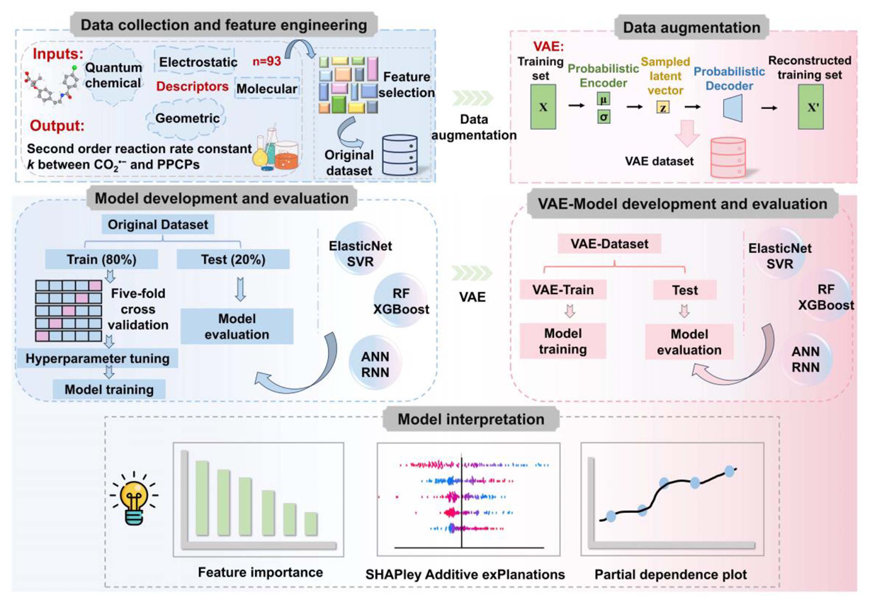 Precise prediction of PPCPs reaction with reactive radicals 》,提出 VAE-ML 数据增强框架。通过变分自编码器(VAE)将 28 条 PPCPs 与 CO₂・⁻反应动力学数据扩展,使训练集从 22 条增至 122 条。最优 VAE-ANN 模型测试集R2=0.88,较基线模型提升 0.15-0.29,且成功泛化至・OH 主导的 AOPs。结合 SHAP 揭示电子转移主导机理,为水处理工艺优化提供精准、可解释的 AI 方案。