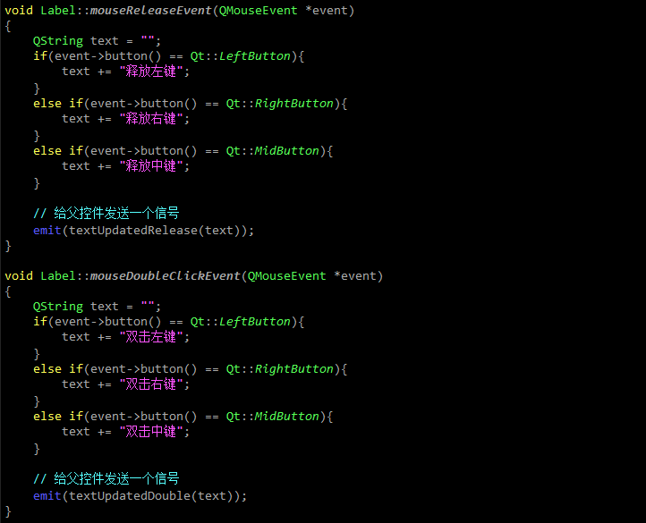 QT中的事件处理其实是基于重写父类的虚函数来实现的.QWidget类中有大量的事件处理函数,在事件触发以后会自动调用这些函数,所以一个子控件如果需要修改某些事件处理机制就需要继承某个父类并重写相应的事件处理函数.