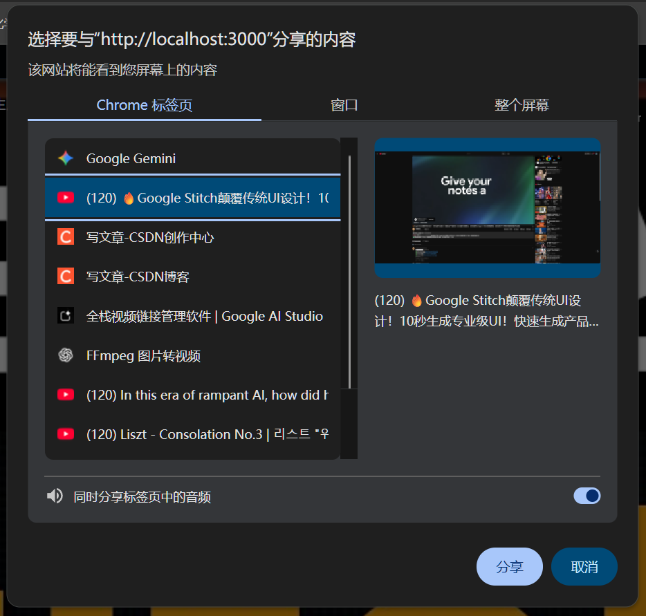 // 1. 唤起浏览器原生屏幕分享弹窗