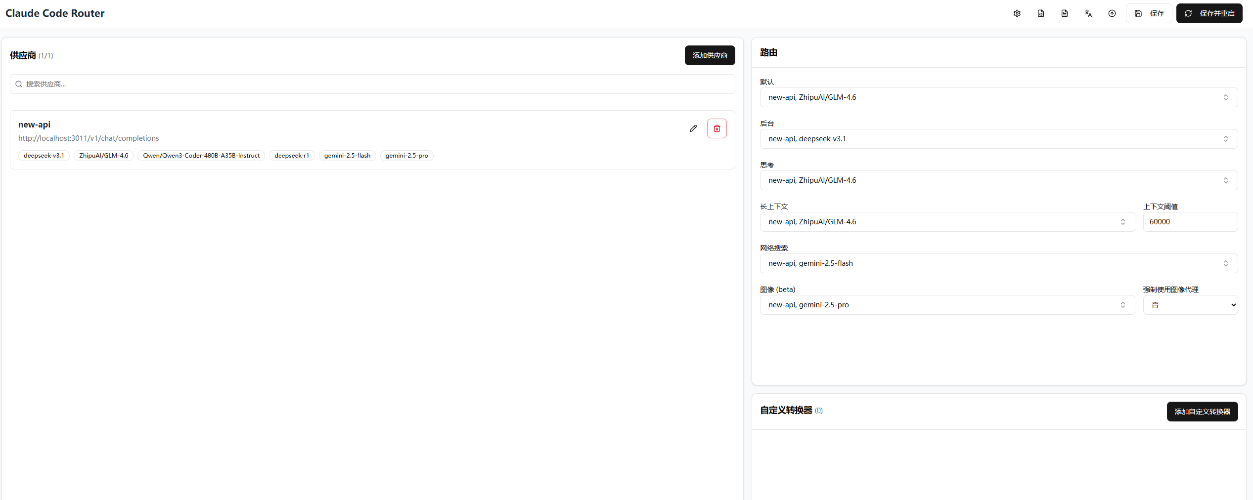 使用什么模型都在路由中这里配置,配置后记得点右上角的保存并重启。重启后,ccr code里运行的模型会自动更新。