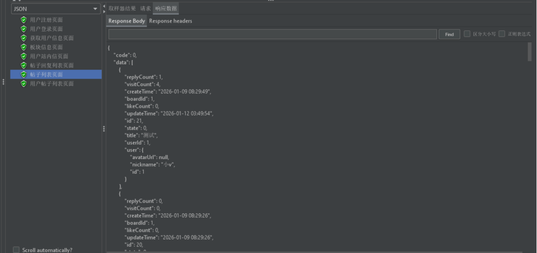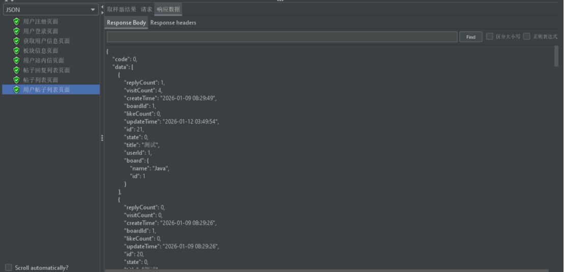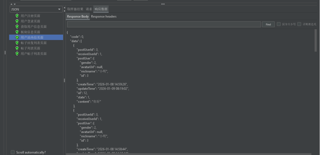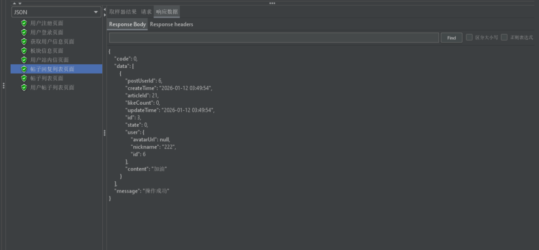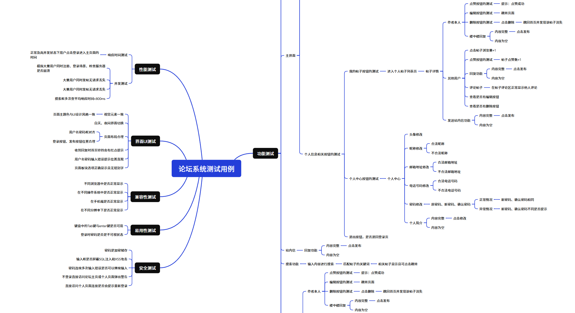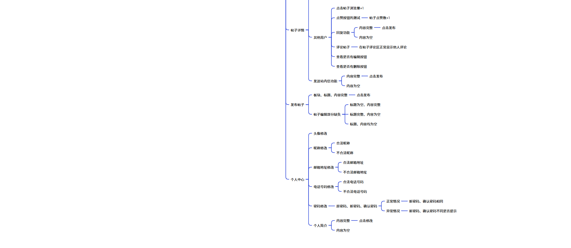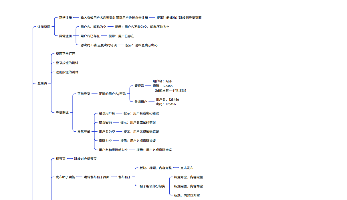 编写用户注册、登录、帖子浏览、帖子发布与编辑、点赞评论与私信等模块的测试用例,保证主体功能完整