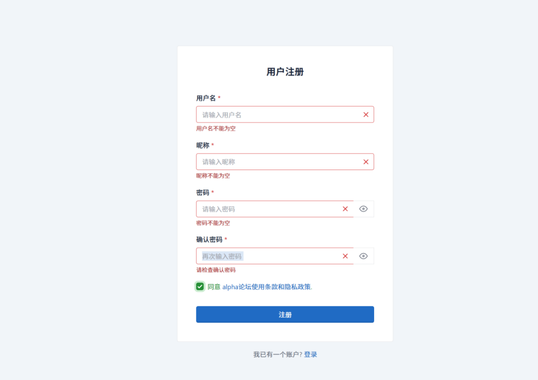 预期:提示用户名不能为空、昵称不能为空