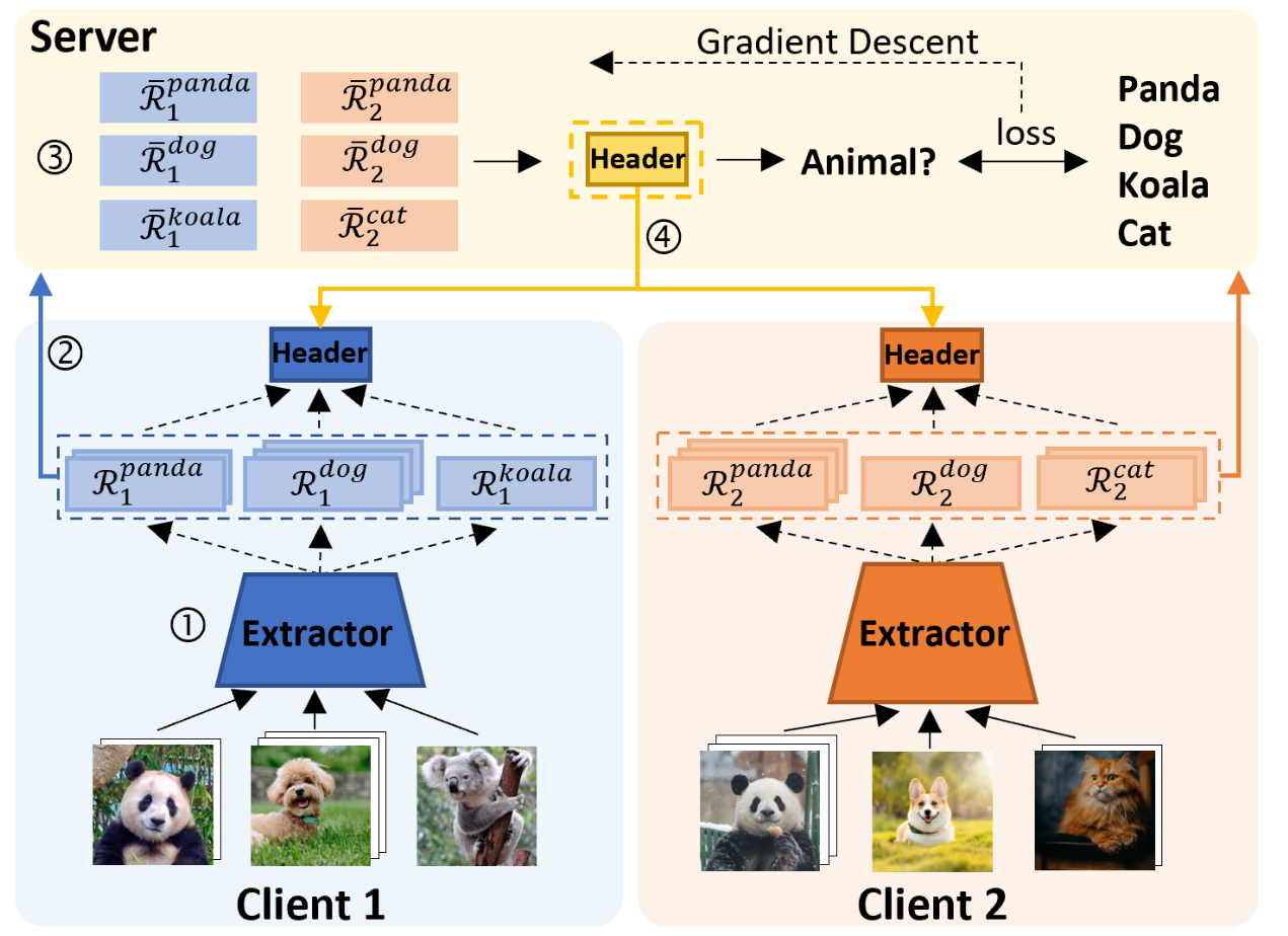 上传类别原型,server用原型训练分类器,广播分类器。本地训练时,特征提取器和分类器同时更新(没有看到交替更新啥的对比实验)。