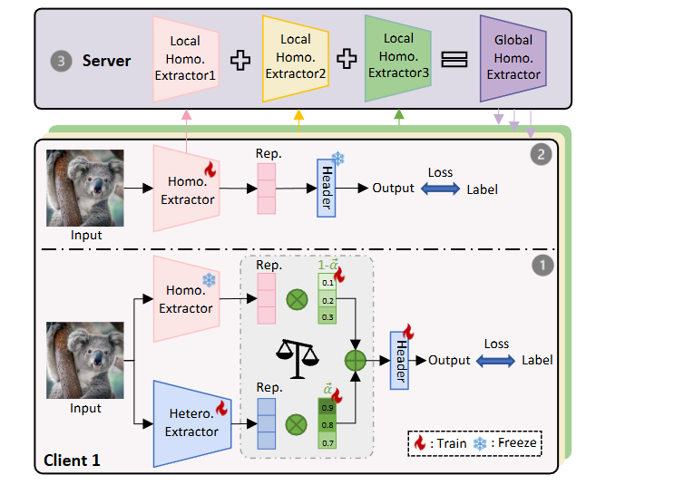 服务端使用同构的辅助模型聚合。本地训练时,先固定辅助模型,训练异构模型Hetero. Extractor+分类器header+特征加权参数 α \alpha α,只计算标签损失。然后固定其他仅训练同构的辅助模型,也仅用标签损失。