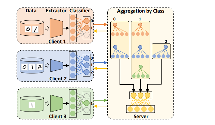 将最后一层的fc(分类器)拆分上传,没有对应的类别就不用上传。按找类别进行聚合,最后拼成完整的fc,广播回传。