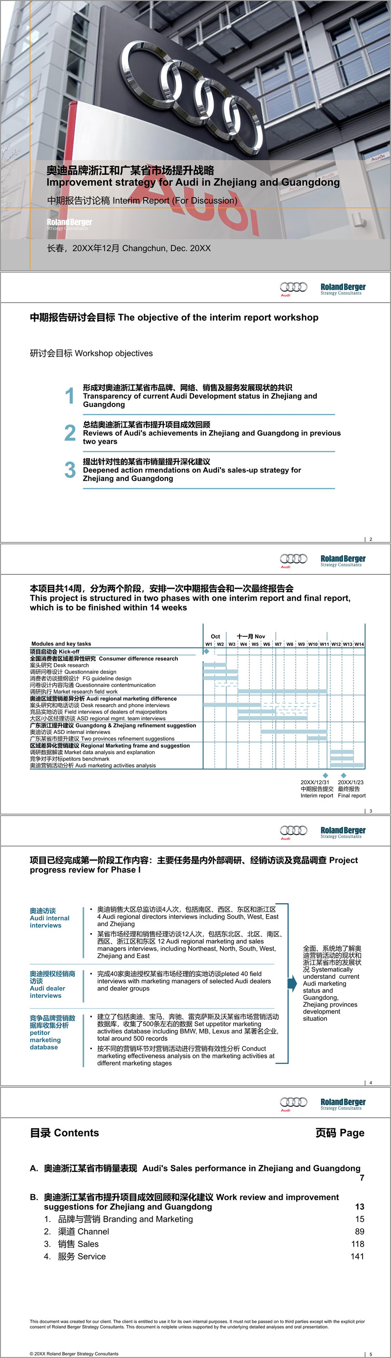 本报告由罗兰贝格为奥迪品牌针对浙江与广东两省市场所撰写,是一份系统性的中期诊断与战略提升方案。报告基于为期14周的内外部调研,包括消费者研究、竞品对标、经销商访谈及奥迪内部沟通,旨在全面评估奥迪在两省的发展现状,并提出针对性的销量提升与品牌强化建议。