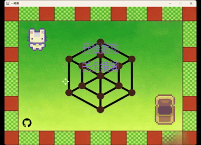 菜单界面有两个部分,一个是"开始游戏",一个是"关卡编辑",左上角和左下角分别是人物动画和宝箱的动画。左下角点击可以进入GitHub仓库。