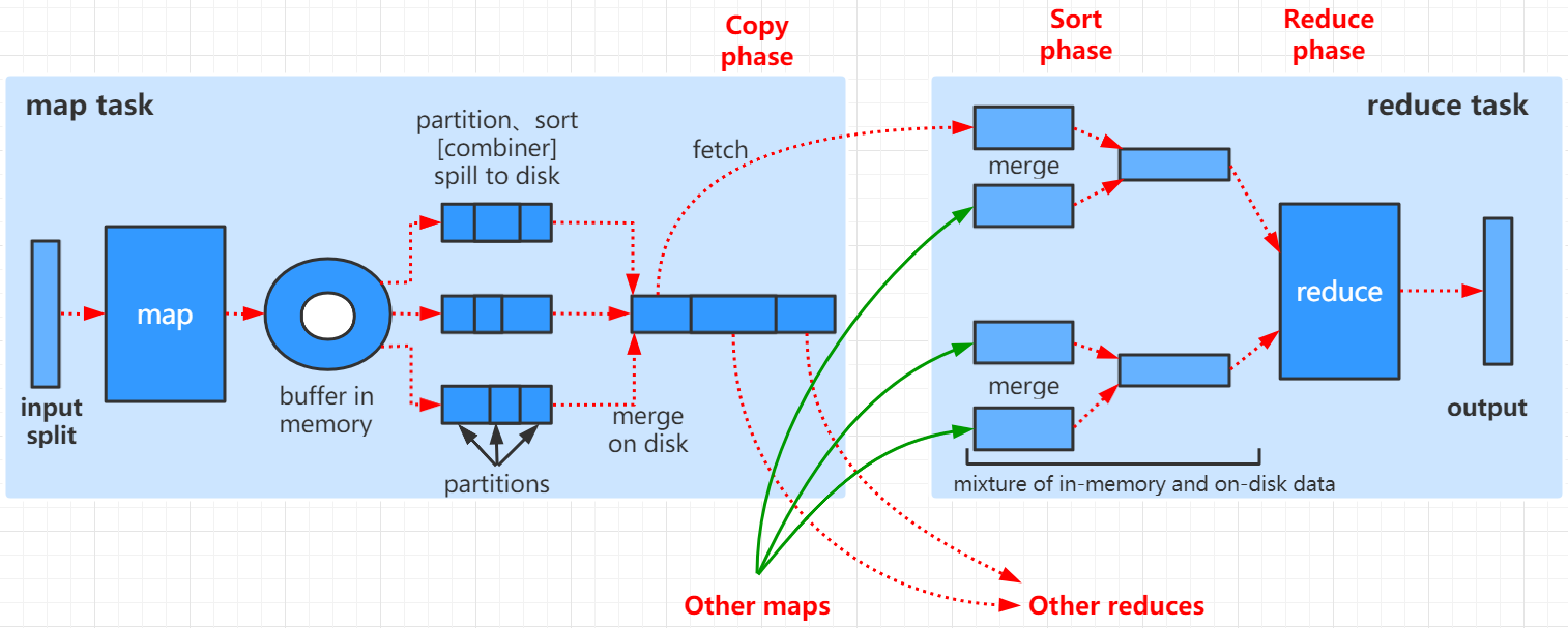 数据经过mapper 任务的处理后,会产生溢出文件,这些文件会被保存到磁盘上。mapper任务完成后,reducer会通过http get的方式从mapper端拷贝对应分区的数据,中间需要经过网络传输。需要做持久化(存盘)或网络传输,这中间就需要做数据的序列化和反序列操作。