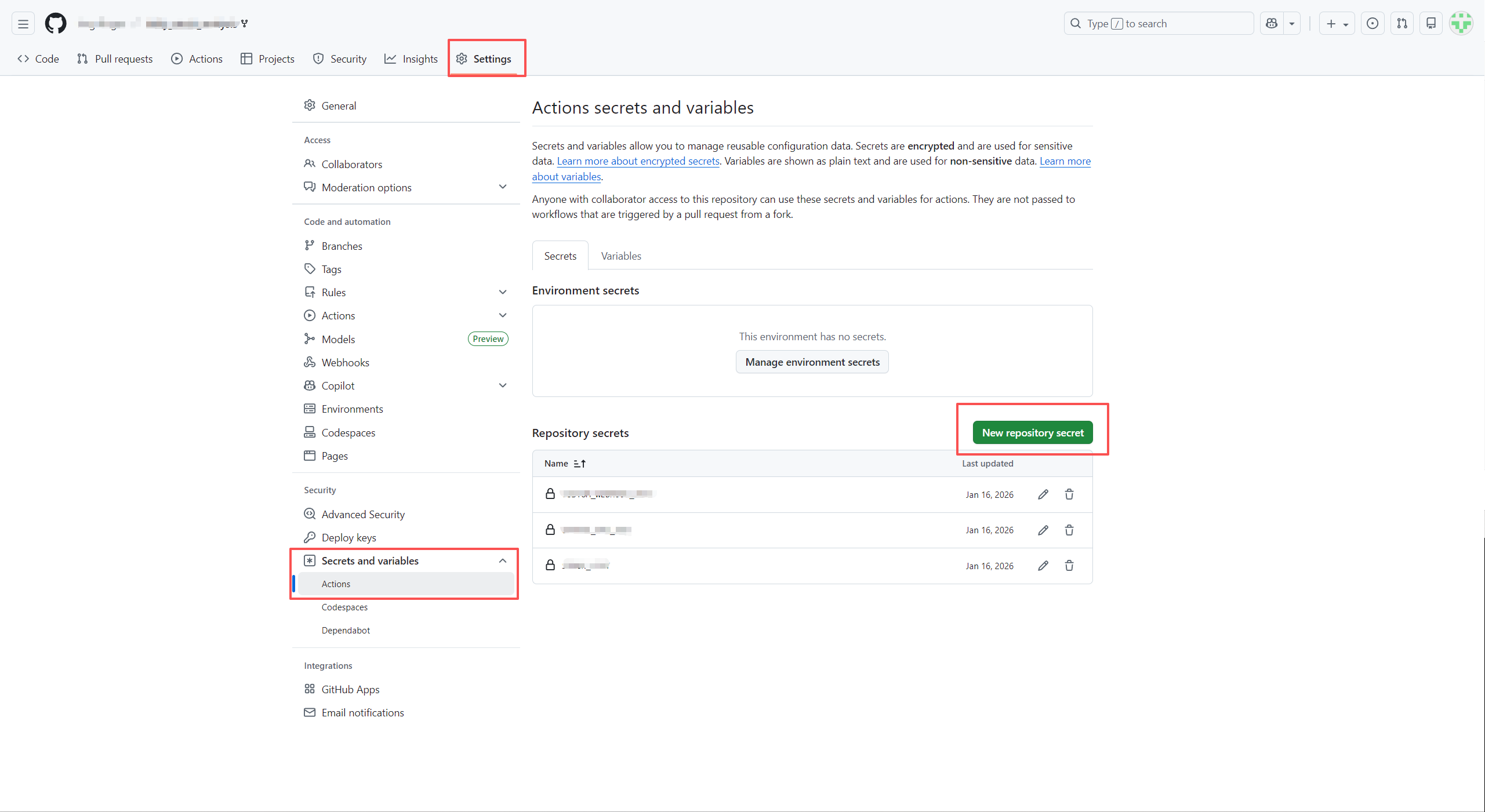 - Settings → Secrets and variables → Actions → New repository secret,配置相关属性,包括自定义机器人的webhook 路径